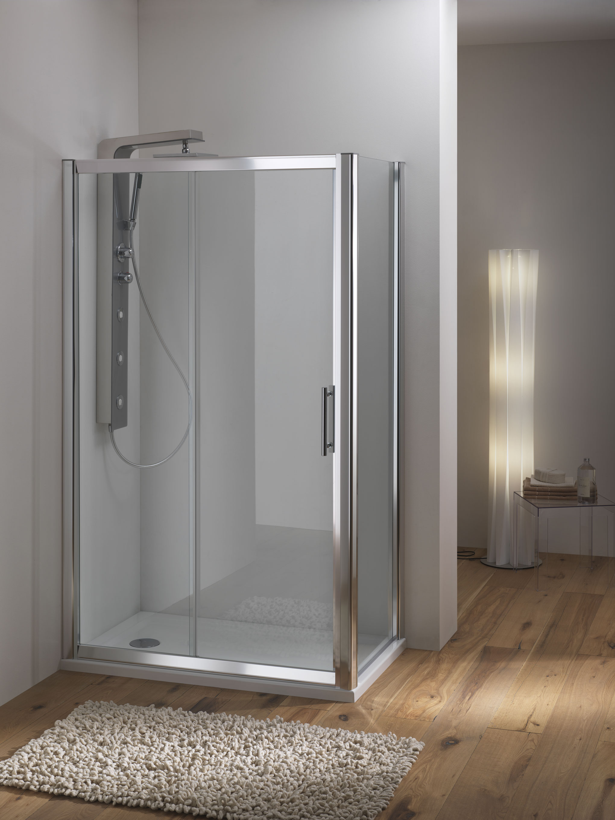 FERBOX Porta 1 anta scorrevole e 1 anta fissa reversibile h.195 cm, cristallo serigrafia euro spessore 6 mm.