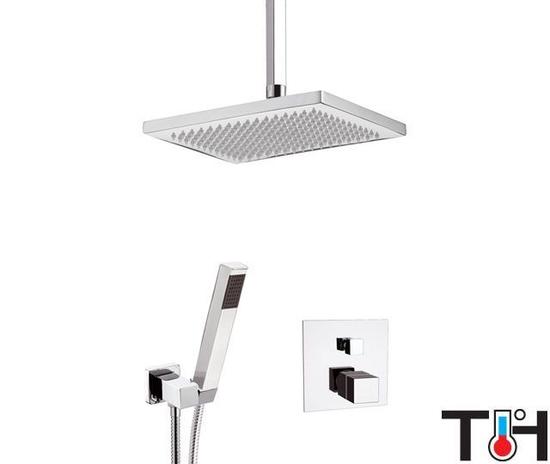 DANIEL RUBINETTERIE Set doccia composto da soffione a pioggia rettangolare con braccio a soffitto, doccetta ad 1 funzione con supporto/presa acqua snodato lusso quadrato, miscelatore incasso termostatico con deviatore. Tutto in ottone cromato.